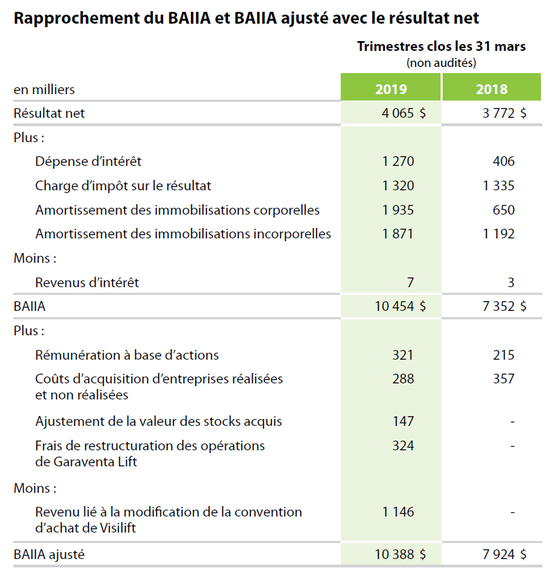 Les informations contenues dans ce communiqué de presse ont été préparées conformément aux IFRS. Toutefois, la Société utilise à des fins d’analyse le BAIIA, le BAIIA ajusté et le BAIIA ajusté par action afin de mesurer sa performance financière. Ces mesures n’ont aucune définition normalisée selon les IFRS. Elles sont donc considérées comme des mesures non conformes aux IFRS. En conséquence, ces mesures pourraient ne pas être comparables à des mesures similaires présentées par d’autres entreprises. Un rapprochement entre le résultat net, le BAIIA et le BAIIA ajusté est montré à la section ci-dessous.