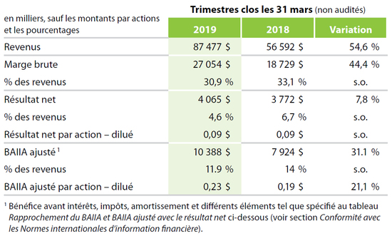 « Nous avons effectué un placement privé par prise ferme de 70,8 millions de dollars en avril 2019, ce qui nous a permis de solidifier notre bilan et de nous donner plus de flexibilité pour notre programme d’acquisitions continu pour des produits complémentaires et de nouveaux réseaux de distribution. L’intégration de nos récentes acquisitions demeure au premier plan de notre stratégie d’entreprise pour 2019, et les opportunités de croissance par l’entremise de nouveaux produits, en particulier en Amérique du Nord, font également partie de notre vision pour cette année, » a conclu M. Bourassa.